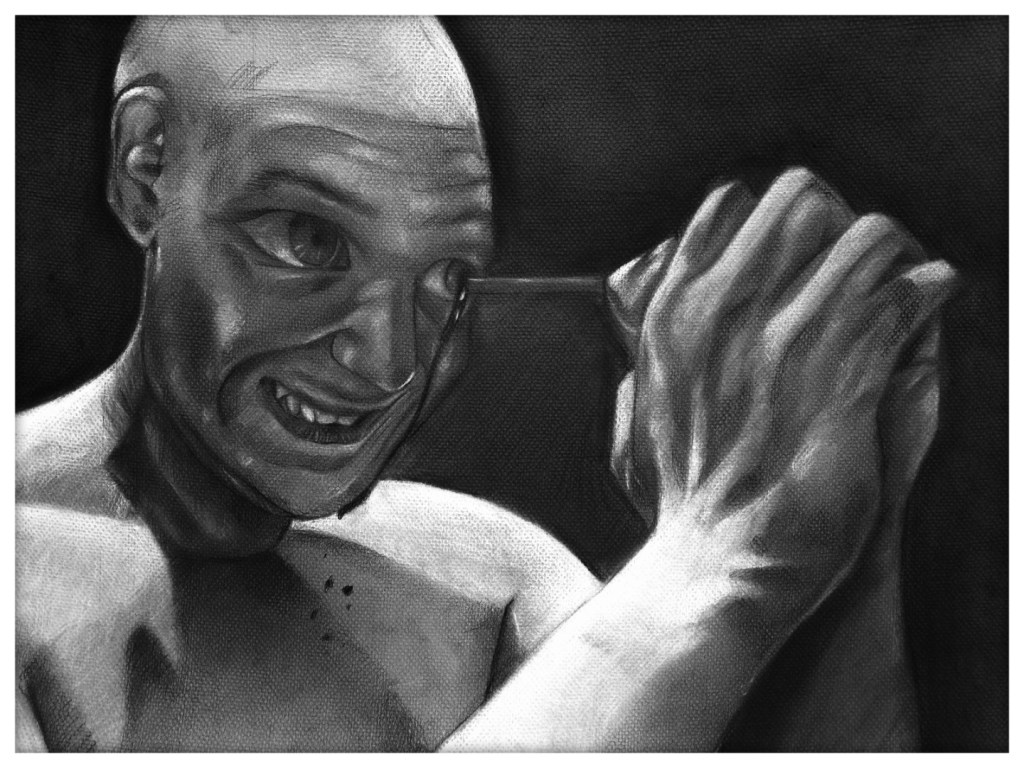 “OW, MY EYE!!” 18 X 24 charcoal on toned paper.